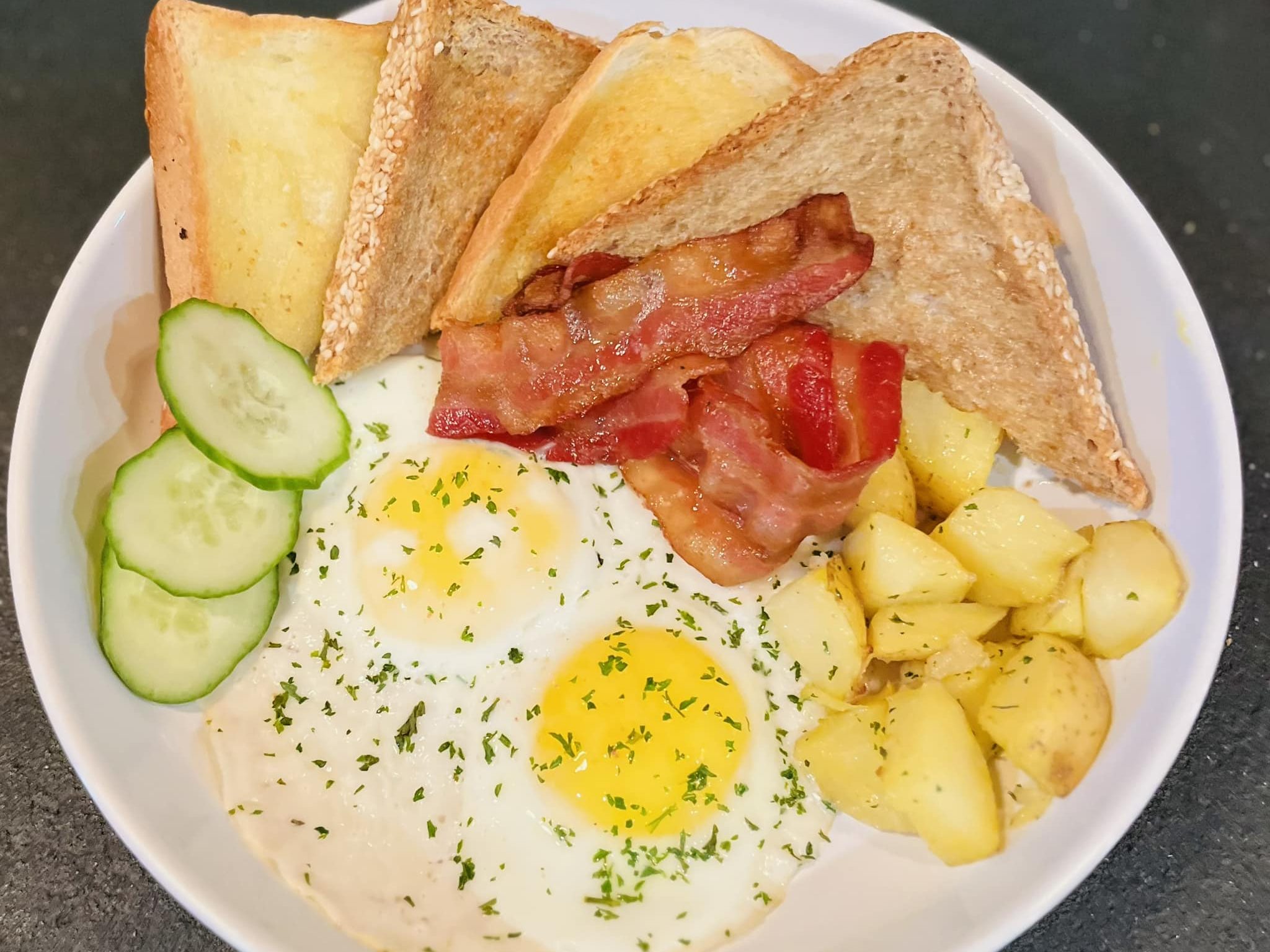Our Hearty Breakfast Classic is a timeless morning favorite that combines sizzling bacon, perfectly cooked eggs, toasted bread, and crispy potatoes. It’s the ultimate breakfast comfort.