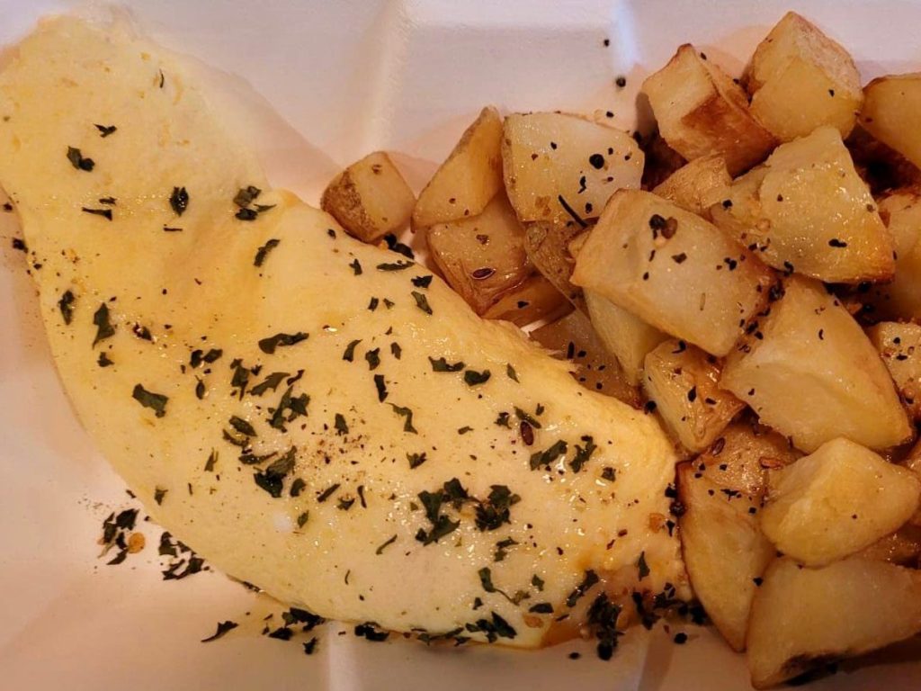 Get ready to dive into breakfast perfection with our Cheesy Omelette Delight. An expertly crafted omelette oozing with melty cheese, served alongside a side of crispy, golden hash browns.